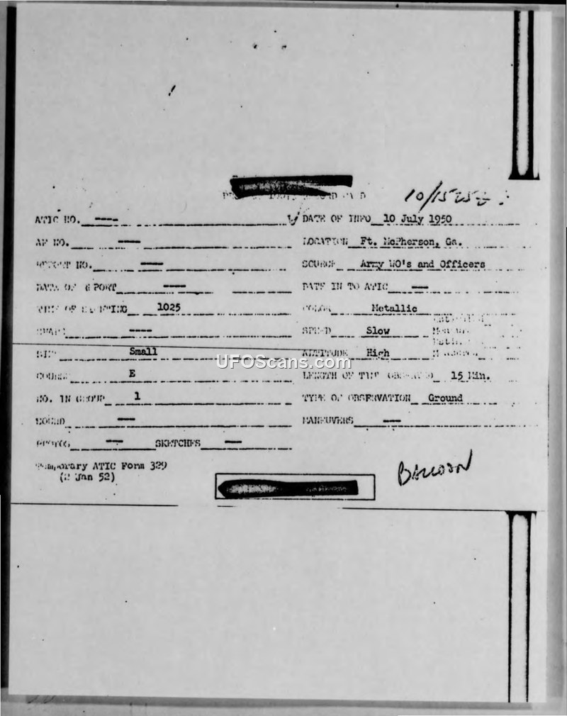 Two CIC officers at Fort McPherson, Georgia, reported a 15-minute sighting of a small, metallic, high-altitude object on July 10, 1950. The report was forwarded to the Air Materiel Command for further assessment.