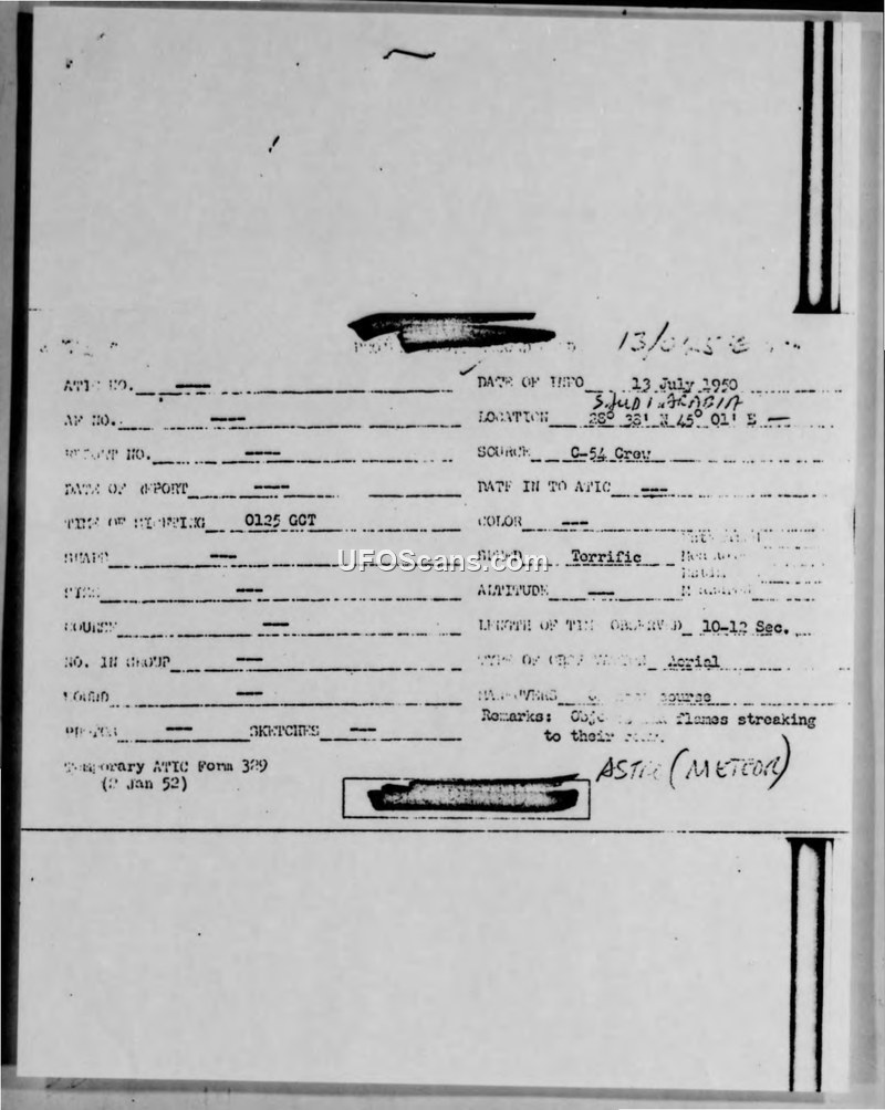 A C-54 flight crew reported a high-speed, light-emitting object over Saudi Arabia on July 13, 1950. The ATIC officially classified the sighting as a meteor.