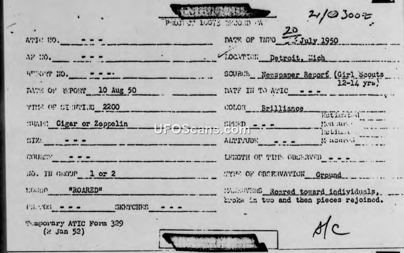 The report documents a sighting by Girl Scouts in Detroit, Michigan, on 20 July 1950. The object was described as a cigar or zeppelin-shaped craft that emitted a roar and appeared to break in two before rejoining. The military report notes that no further investigation is planned.