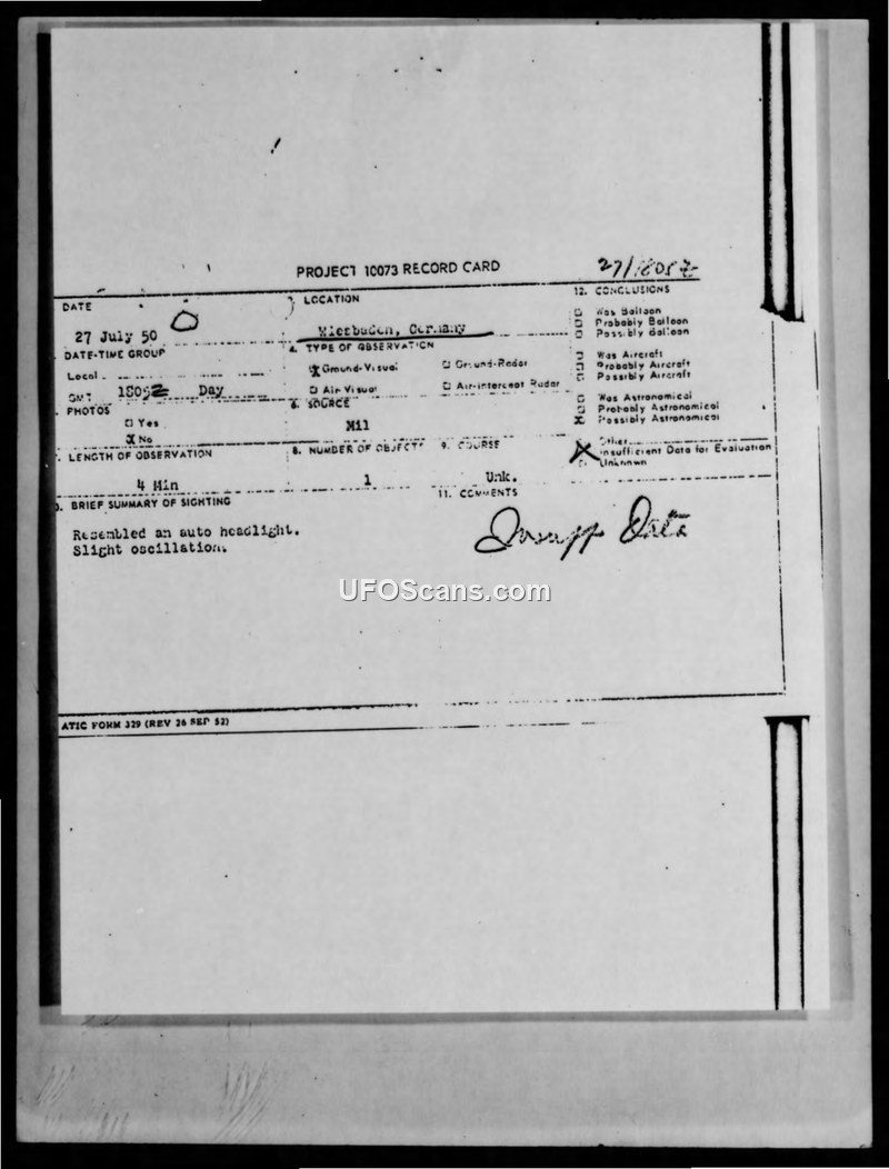 An unidentified object resembling an automobile headlight was sighted over Wiesbaden Air Base on 27 July 1950. Intelligence investigators concluded there was insufficient data to identify the object, and tower operators reported no unusual activity.