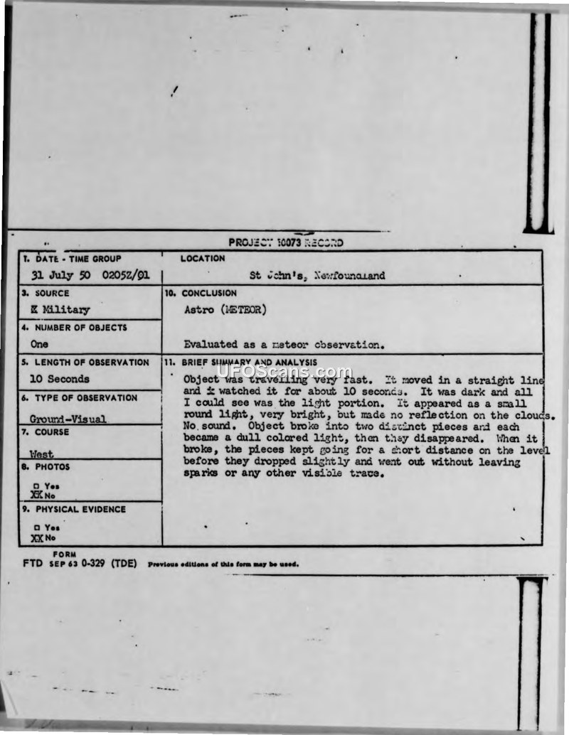 This report details a July 1950 sighting of a bright, fast-moving object over St. John's, Newfoundland, which was officially classified as a meteor. The document includes witness statements from military personnel and an OSI investigation report.