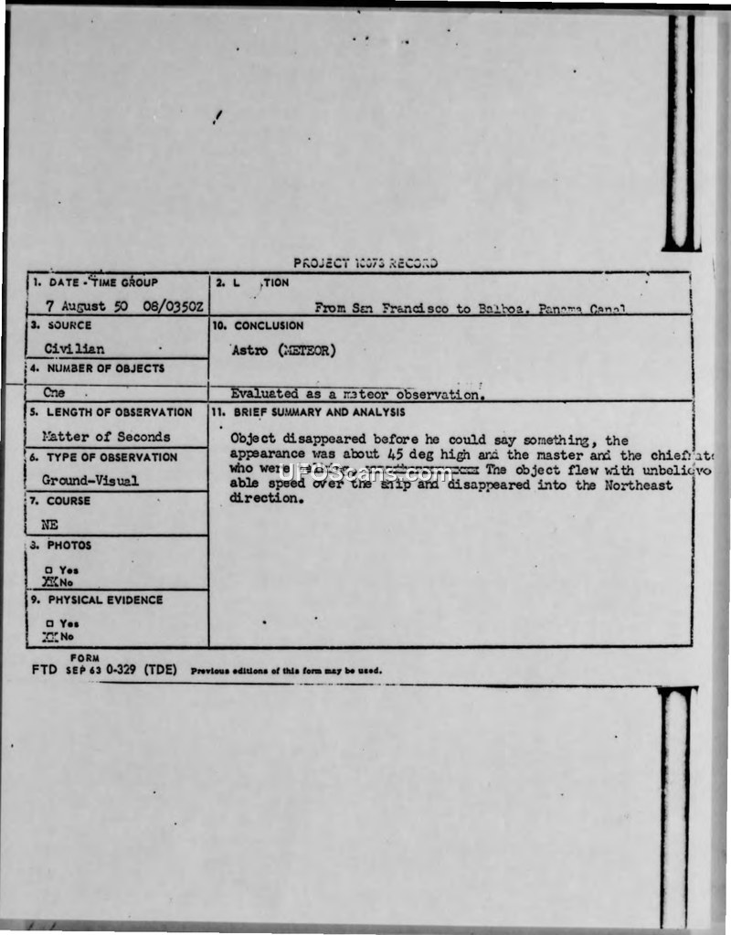 The object flew with unbelievable speed over the ship and disappeared into the Northeast direction.