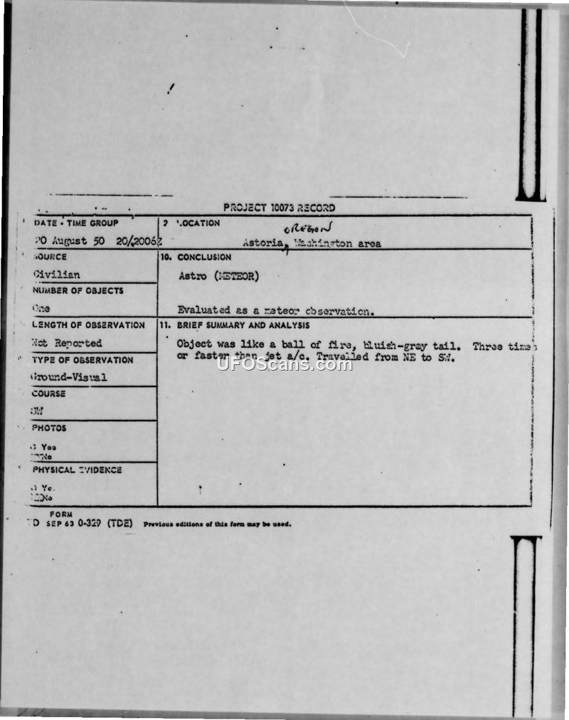 Project 10073 Record: Astoria, Washington Area Sighting, 20 August 1950