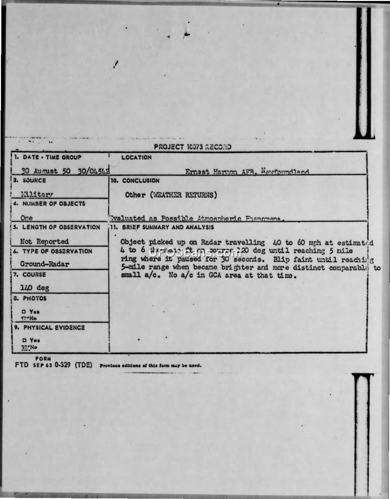 This report documents unidentified radar and visual sightings near Ernest Harmon AFB in August 1950. Despite investigations, the phenomena remained unexplained, with authorities suggesting atmospheric causes.