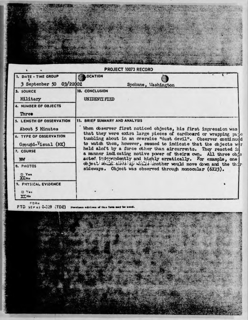 This document contains official military reports of three separate UFO sightings near Spokane, Washington, in September 1950. The 57th Air Division concluded the objects were unidentified after ruling out conventional explanations.
