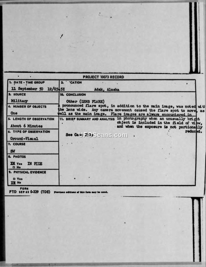 Project 10073 Record: Adak, Alaska Sighting, 11 September 1950
