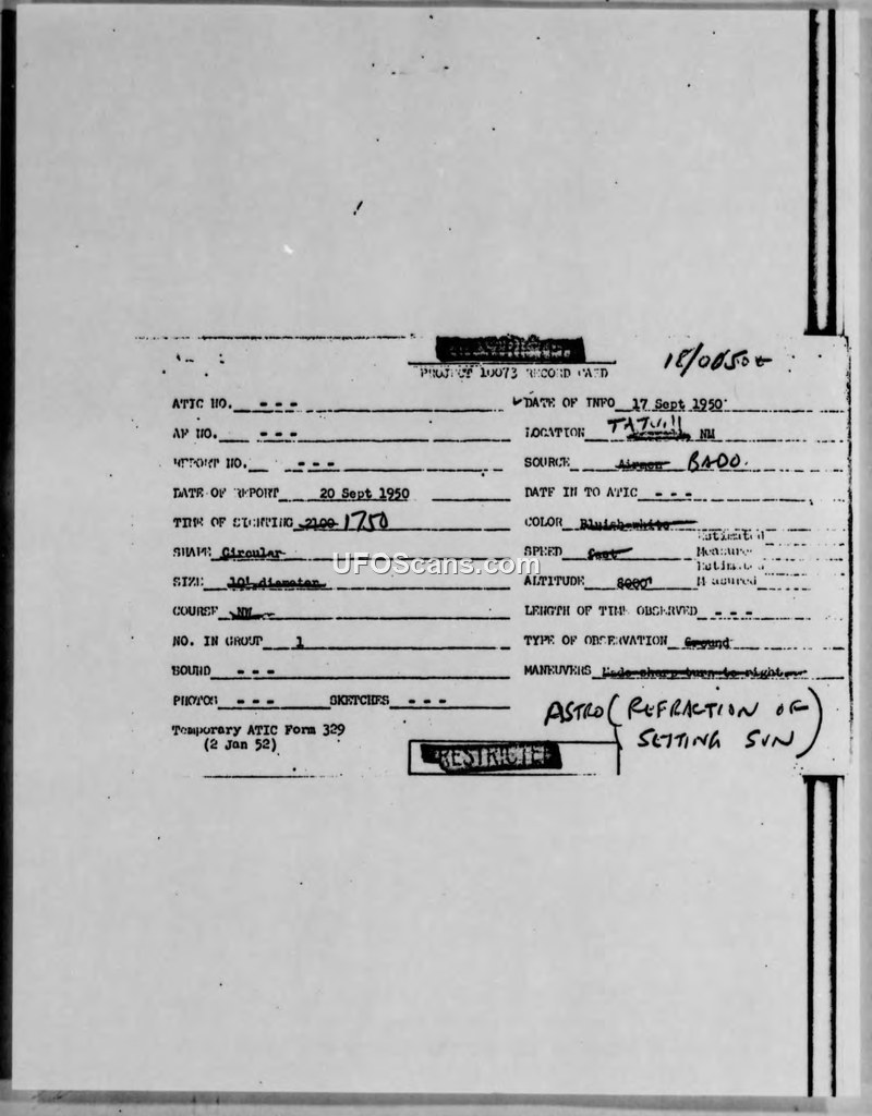 A geologist reported an orange-red aerial object near Tatum, New Mexico, on 17 September 1950. The Air Force intelligence report suggests the sighting was likely an astronomical phenomenon caused by the refraction of the setting sun.