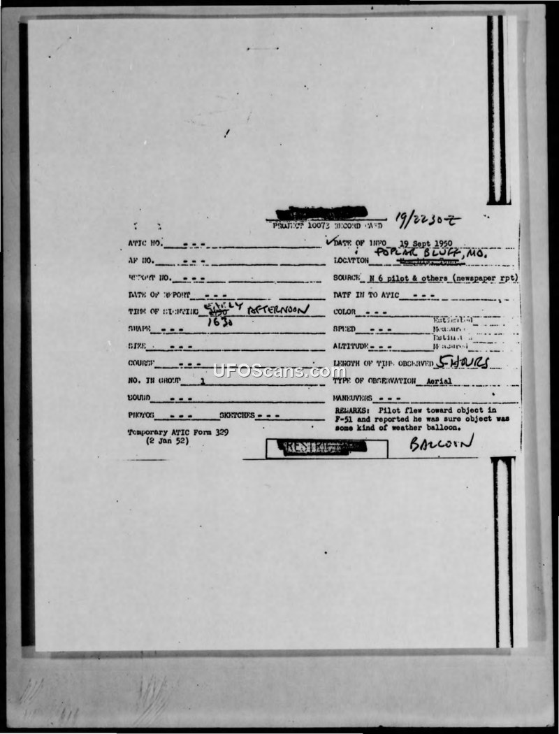 Project 10073 Record Card — Poplar Bluff, MO, 19 September 1950
