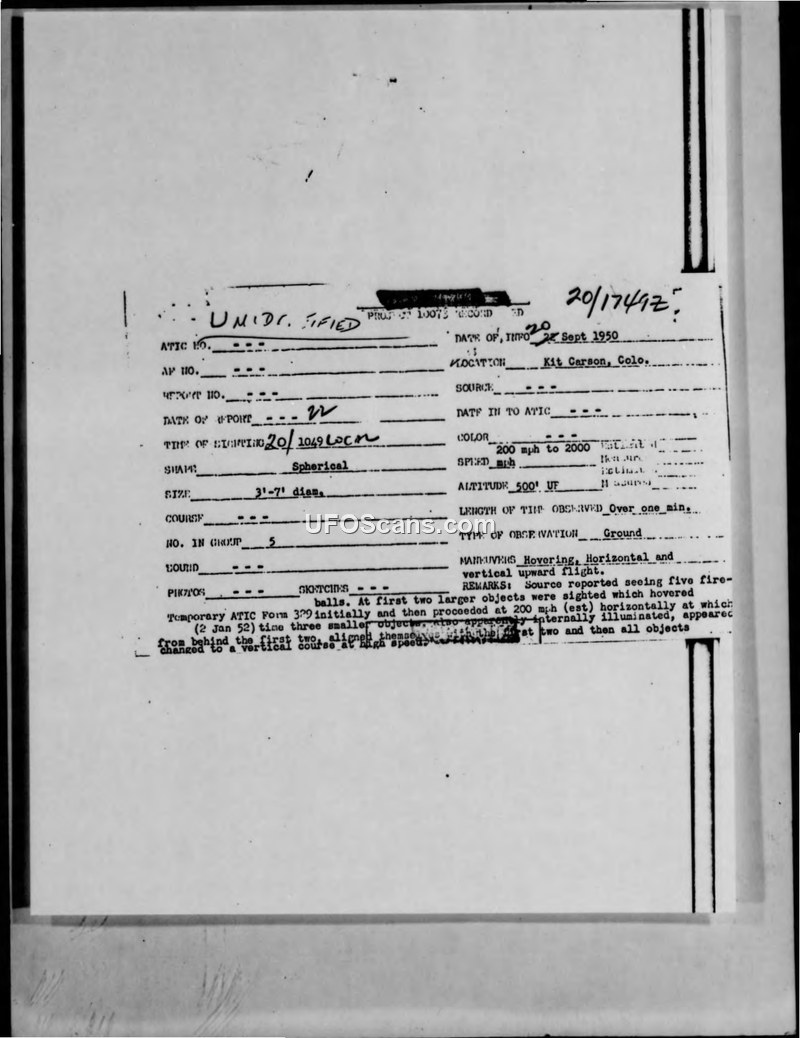 Fire Balls or Flying Saucers - Kit Carson, Colorado, 20 September 1950