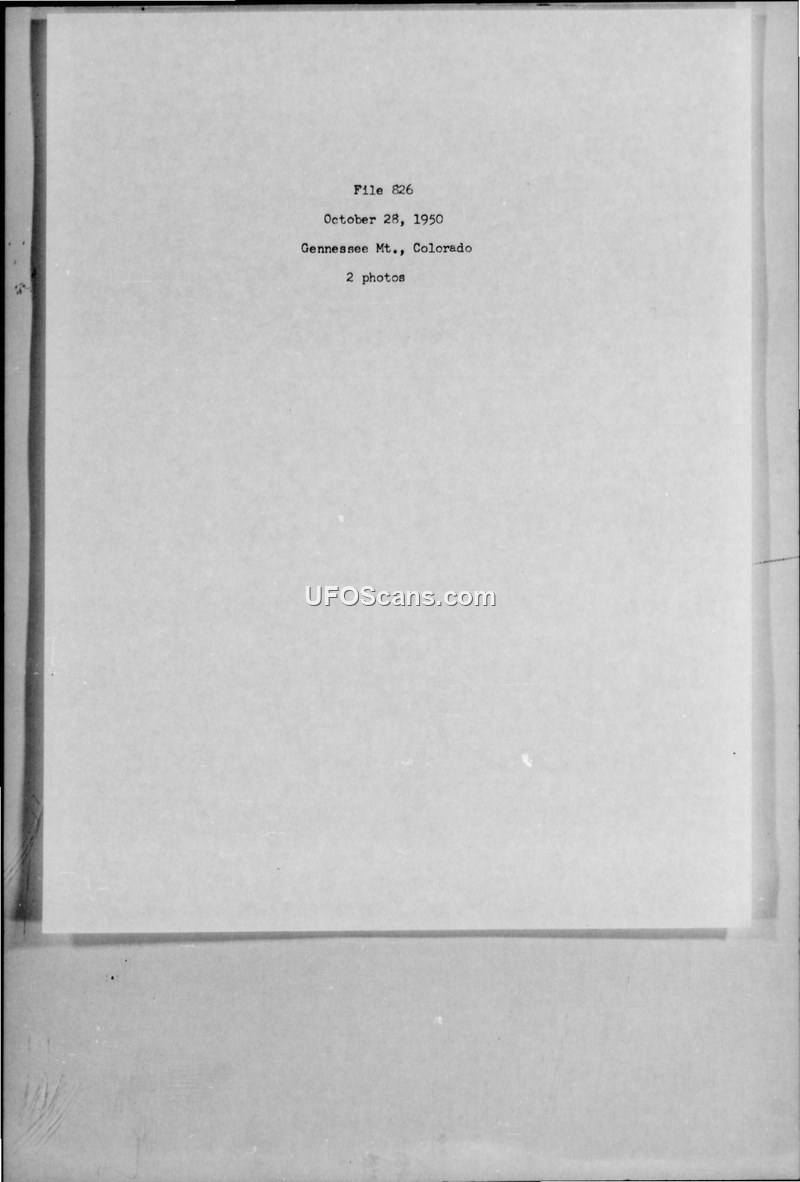 File 826 documents a sighting at Gennessee Mountain, Colorado, on October 28, 1950. The file includes two photographs as evidence but provides no narrative details or investigative conclusions.