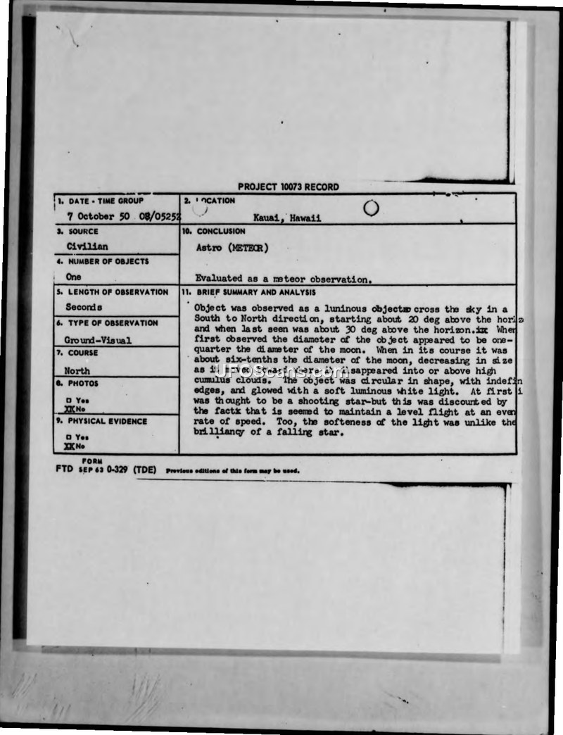 Project 10073 Record — Sighting in Kauai, Hawaii, 7 October 1950