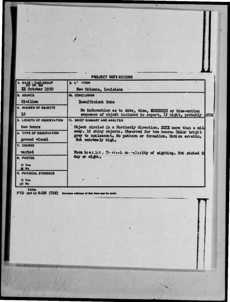 This intelligence report compiles multiple civilian UFO sightings in Louisiana from October and November 1950. While the military collected these accounts, they officially dismissed at least one instance as a balloon observation.