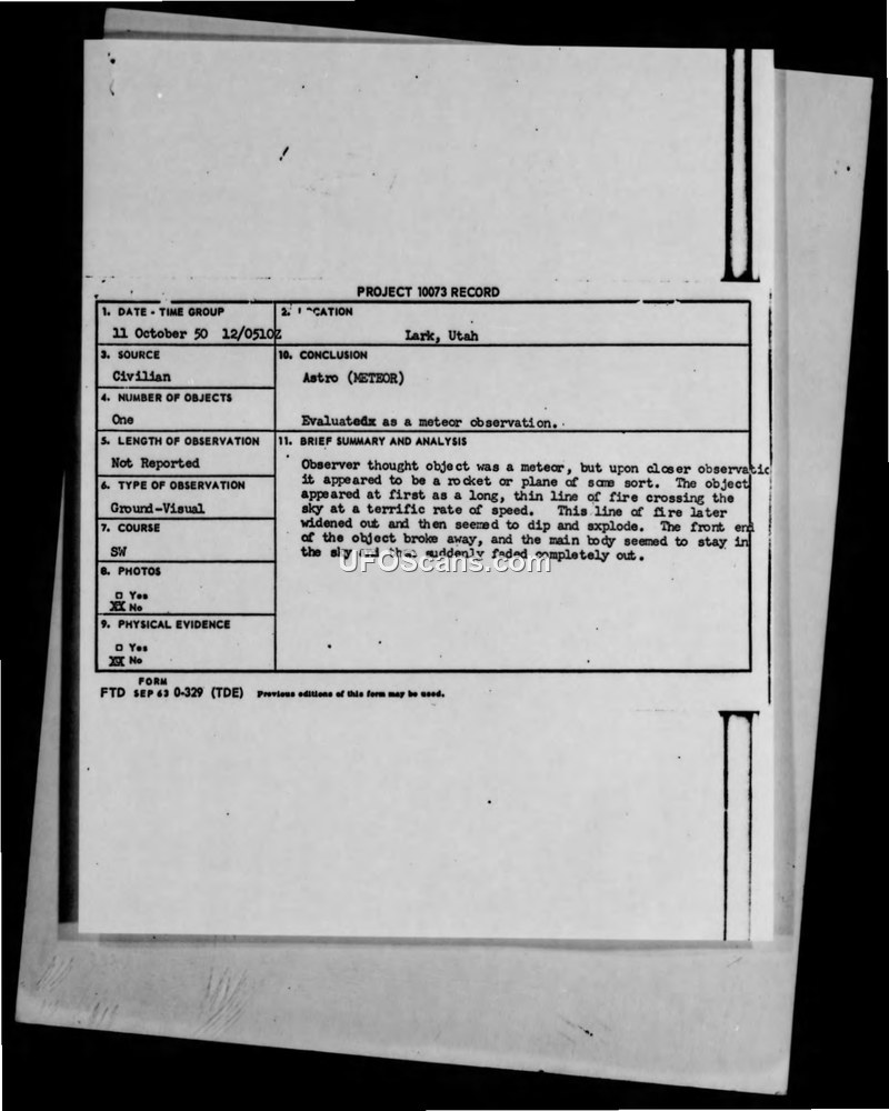 A 1950 sighting report from Lark, Utah, describes an object initially thought to be a meteor but later suspected to be a rocket or plane. The official conclusion for the incident was 'Astro (METEOR)'.