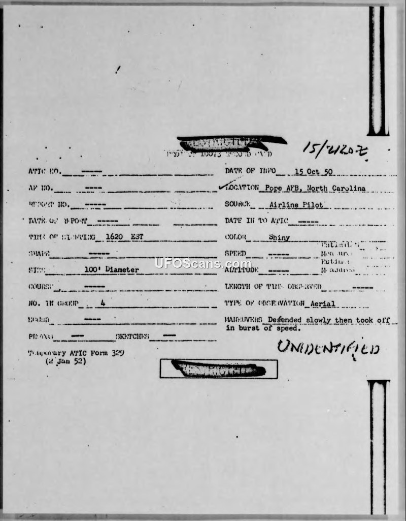 This file contains reports of four unidentified saucer-like objects sighted by a commercial airline pilot near Pope AFB on October 15, 1950. The military investigated the incident, linking it to a separate observation of a spheroid object, and forwarded the findings to the Air Materiel Command.