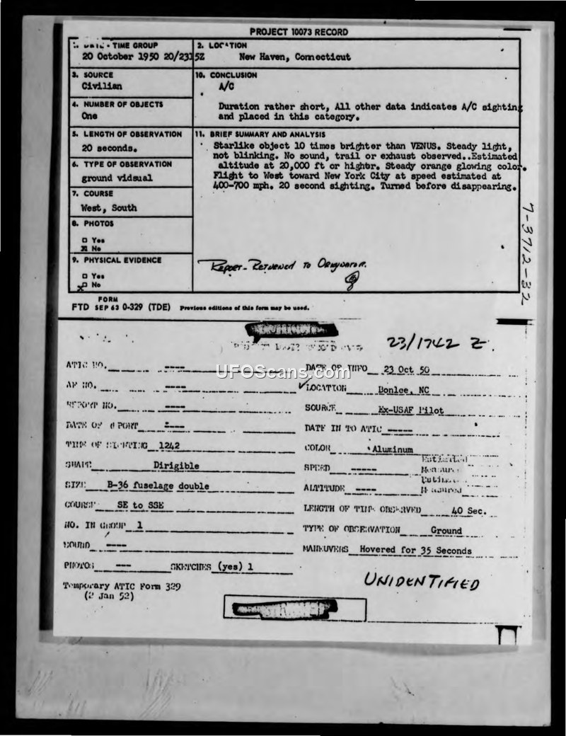 This document contains two distinct Project 10073 records regarding aerial sightings. The first entry details a sighting on October 20, 1950, in New Haven, Connecticut. A civilian witness reported a starlike object, ten times brighter than Venus, exhibiting a steady, non-blinking light. The object was described as having a steady orange glowing color, moving west toward New York City at an estimated speed of 400-700 mph at an altitude of 20,000 feet or higher. The observation lasted 20 seconds before the object turned and disappeared. The official conclusion for this incident was that it was an aircraft (A/C). The second entry, dated October 23, 1950, concerns a sighting in Bonlee, North Carolina, reported by an ex-USAF pilot. This object was described as a double B-36 fuselage shaped like a dirigible, aluminum in color. The witness reported that the object hovered for 35 seconds, with a total observation time of 40 seconds. The flight path was noted as SE to SSE. This specific report is marked as UNIDENTIFIED. Both reports were processed by ATIC, with the New Haven report noting that it was returned to the originator.