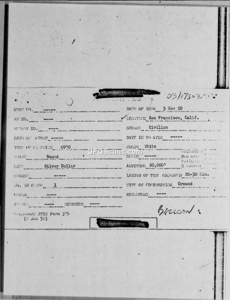 UNIDENTIFIED OBJECT Observed directly overhead San Francisco, California at approximately 0930 hours, 3 November 1950