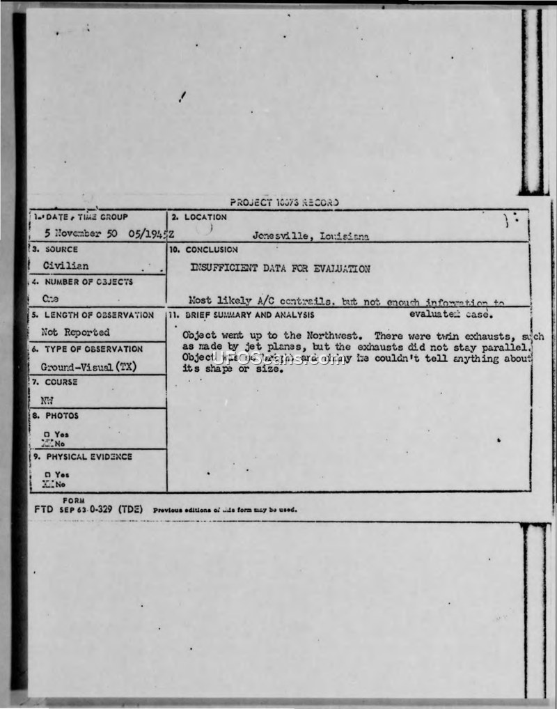 This intelligence report compiles multiple civilian sightings of unconventional aircraft in Louisiana during late 1950. The Air Force concluded that there was insufficient data to evaluate the reports, suggesting some might be aircraft contrails.