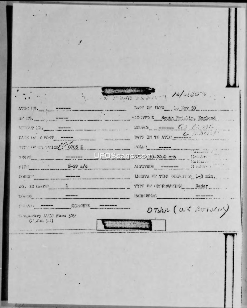 This document is a collection of reports and correspondence regarding a series of radar contacts with an unidentified airborne object over England on 10 November 1950. The observations were made by personnel of Detachment H, 3903rd Radar Bomb Scoring (RBS) Squadron, operating an AN/MPQ-2 radar set at Heston Airdrome. Between 0859Z and 1026Z, four distinct radar contacts were recorded. The object was described as having a size comparable to a B-29 or C-54 aircraft, with speeds ranging from 30 to 1,000 miles per hour. The object exhibited highly unusual flight characteristics, including abrupt changes in course, rapid acceleration, and significant altitude changes, which the radar operators found impossible to track with standard equipment. The weather conditions at the time were poor, with 10/10 cloud cover, rain, and high winds.
