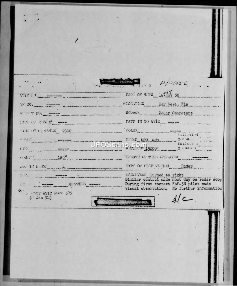This document collection details military investigations into unidentified aircraft sightings near Key West, Florida, in November 1950. The Air Technical Intelligence Center concluded these were likely conventional aircraft, citing a lack of evidence for unconventional origins.