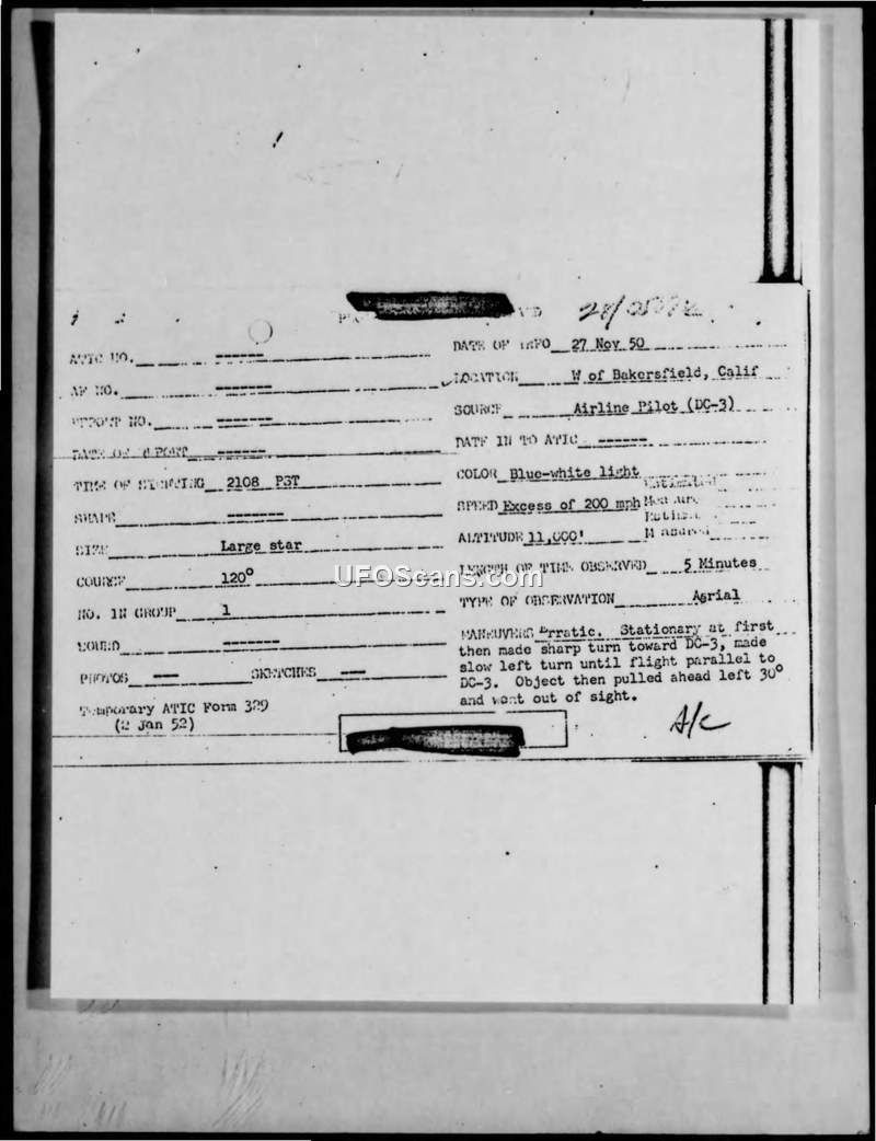 A civil airline crew reported an unidentified blue-white light performing erratic maneuvers near Bakersfield, California, on 27 November 1950. Military intelligence concluded the object was not a conventional aircraft based on its speed and flight behavior.