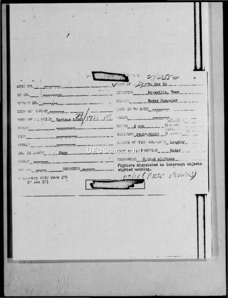 This report details unidentified radar returns over Oak Ridge, Tennessee, in November 1950. Investigators concluded the returns were caused by atmospheric ducting rather than physical objects.