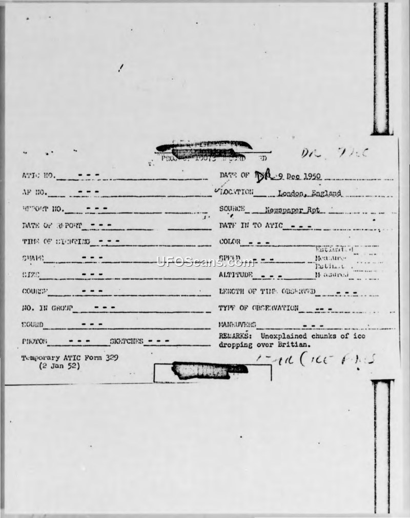 In late 1950, reports of falling ice blocks in Great Britain prompted a military investigation. The military concluded the objects were not related to their experiments, while public speculation linked the events to flying saucers.