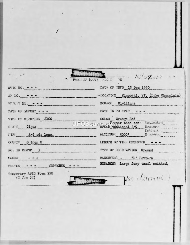 The report documents a sighting of an unconventional, cigar-shaped object by multiple witnesses in Winooski, Vermont, on December 13, 1950. The object emitted a fiery trail and performed a sharp 'L' maneuver.
