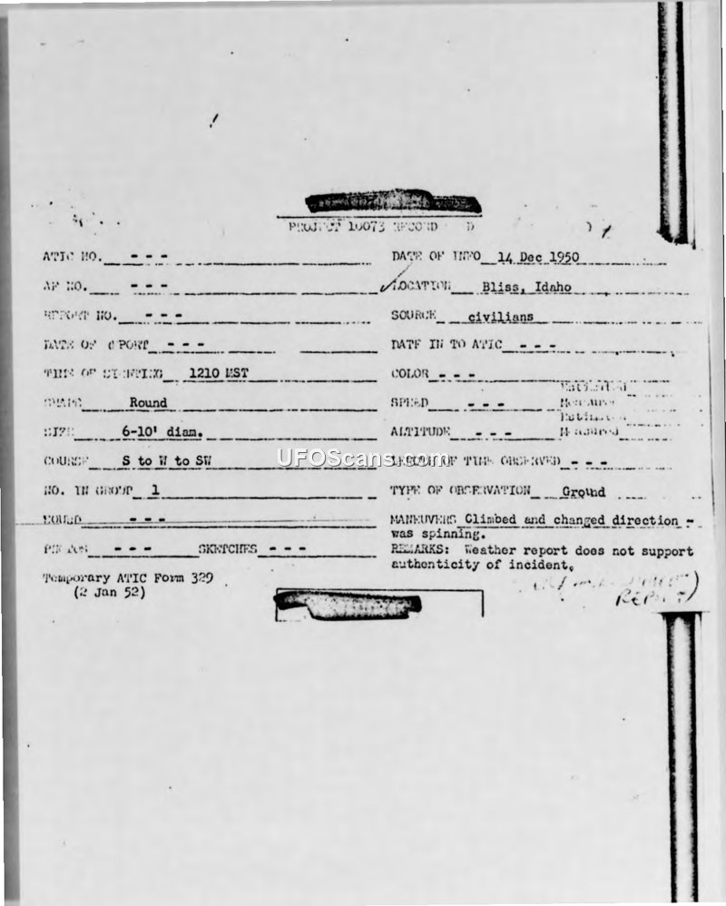 The report documents a sighting by three civilians, including a pilot, of a round object near Bliss, Idaho. The object exhibited rapid movement and spinning, but the official investigation concluded that local weather reports cast doubt on the authenticity of the incident.