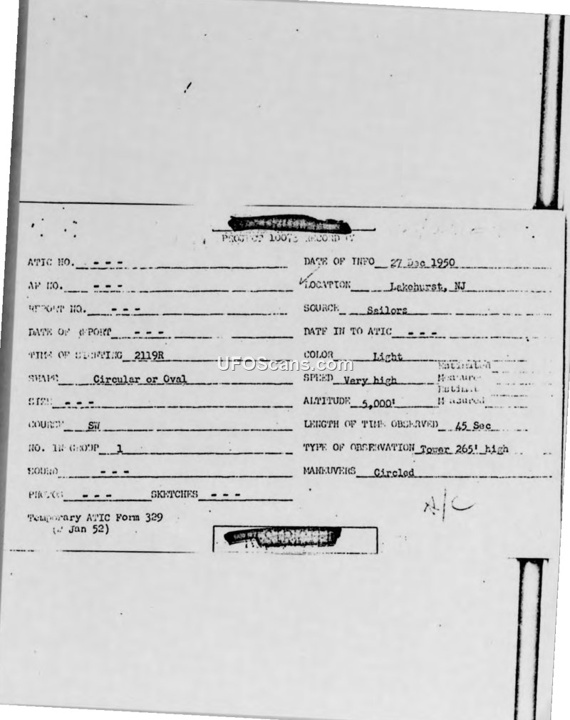 Two naval tower operators at Lakehurst, NJ, reported a high-speed, circular, white light performing an impossibly tight turn on December 27, 1950. The report was formally processed through the District Intelligence Office to the Air Material Command.