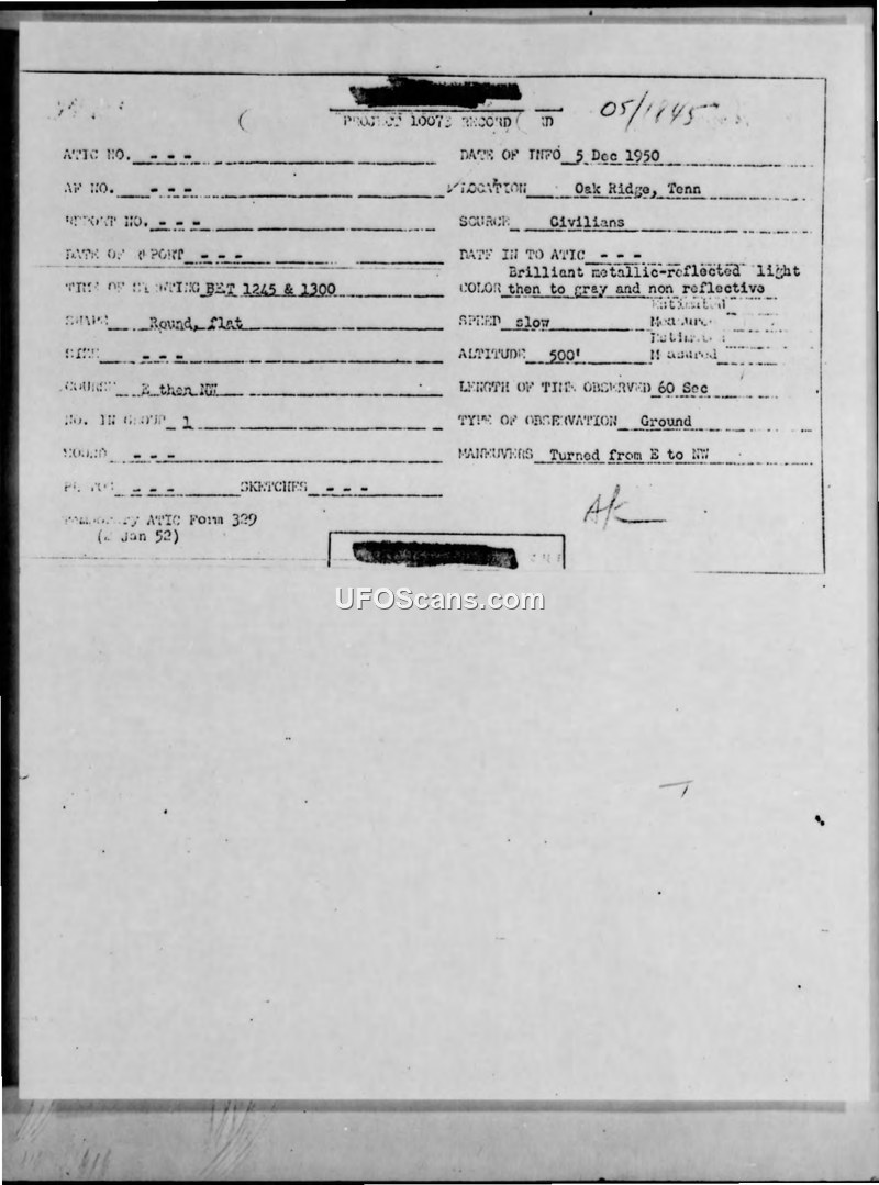 On December 18, 1950, multiple witnesses at the Oak Ridge facility observed a bright, circular, metallic-appearing object. Radar stations simultaneously tracked an unidentified target, but investigators concluded the data was insufficient to establish a track or identify the object.