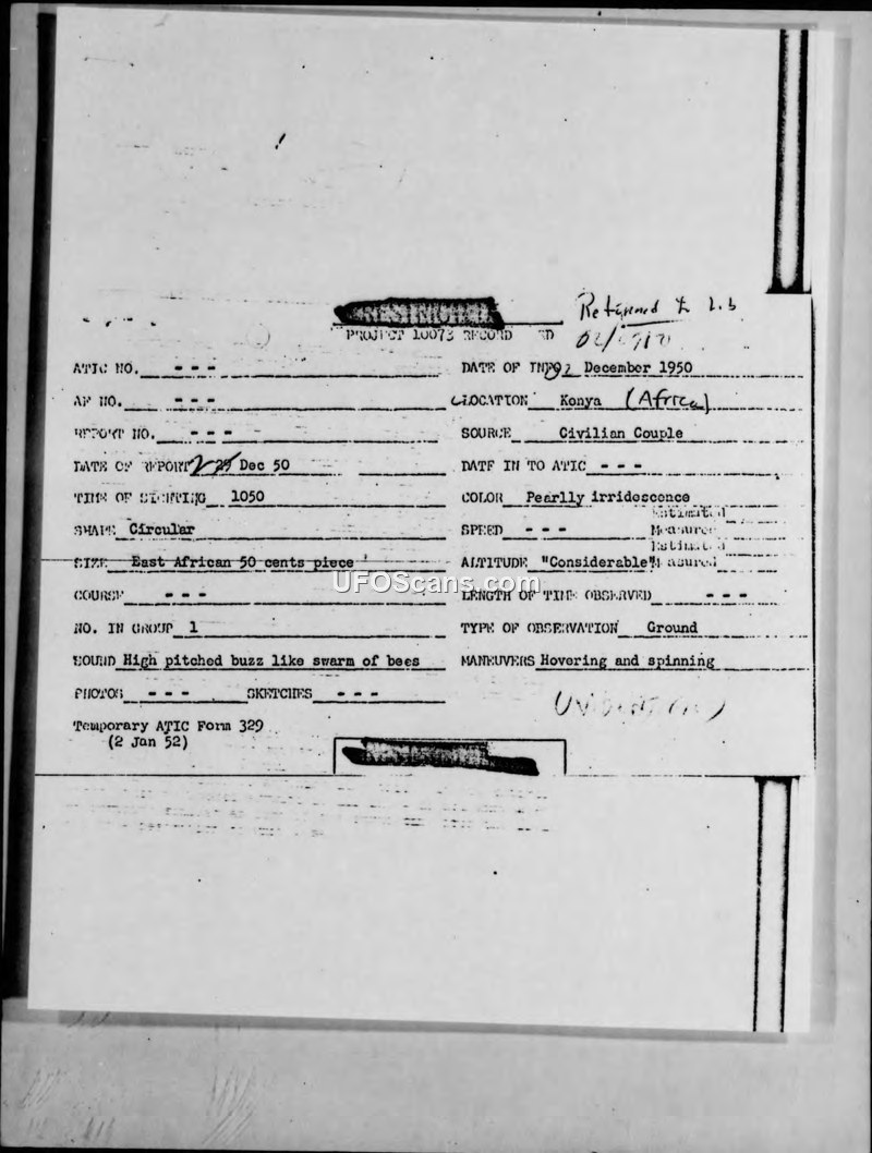 A civilian couple in Kenya reported a circular, pearly, spinning object hovering over a golf course on December 2, 1950. The sighting was accompanied by a high-pitched buzzing sound.