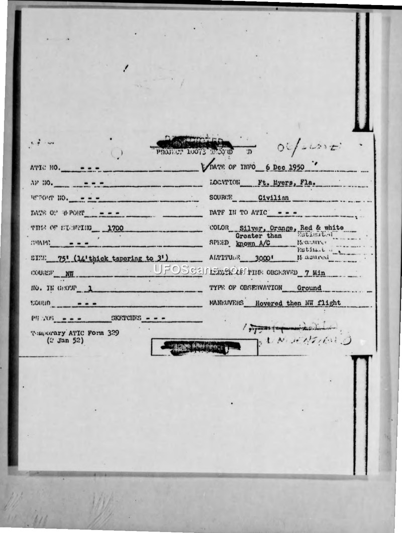 Project 10073 Record: Sighting Report - Fort Myers, Florida, 6 December 1950