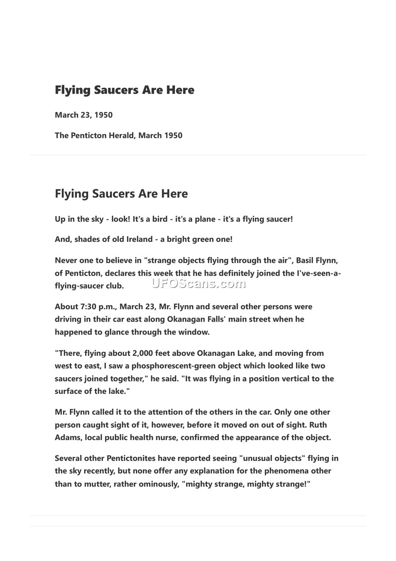 This document is a newspaper report from The Penticton Herald, dated March 23, 1950, detailing a UFO sighting in the Okanagan Falls area of British Columbia, Canada. The primary witness, Basil Flynn, a resident of Penticton who previously expressed skepticism regarding such phenomena, reported observing a strange object while driving along the main street of Okanagan Falls at approximately 7:30 p.m. on the date of the report. Flynn described the object as phosphorescent-green in color and noted that it appeared to be composed of two saucers joined together. He estimated the object was flying at an altitude of 2,000 feet above Okanagan Lake, moving in a west-to-east trajectory, and oriented in a vertical position relative to the lake's surface. Flynn attempted to alert other passengers in his vehicle to the sighting; however, only one other individual, a local public health nurse named Ruth Adams, was able to observe the object before it disappeared from view. The article notes that this sighting occurred amidst a series of recent reports of unusual objects in the sky by other Penticton residents, though no formal explanations for these phenomena were provided, with witnesses often describing the events simply as 'mighty strange.'