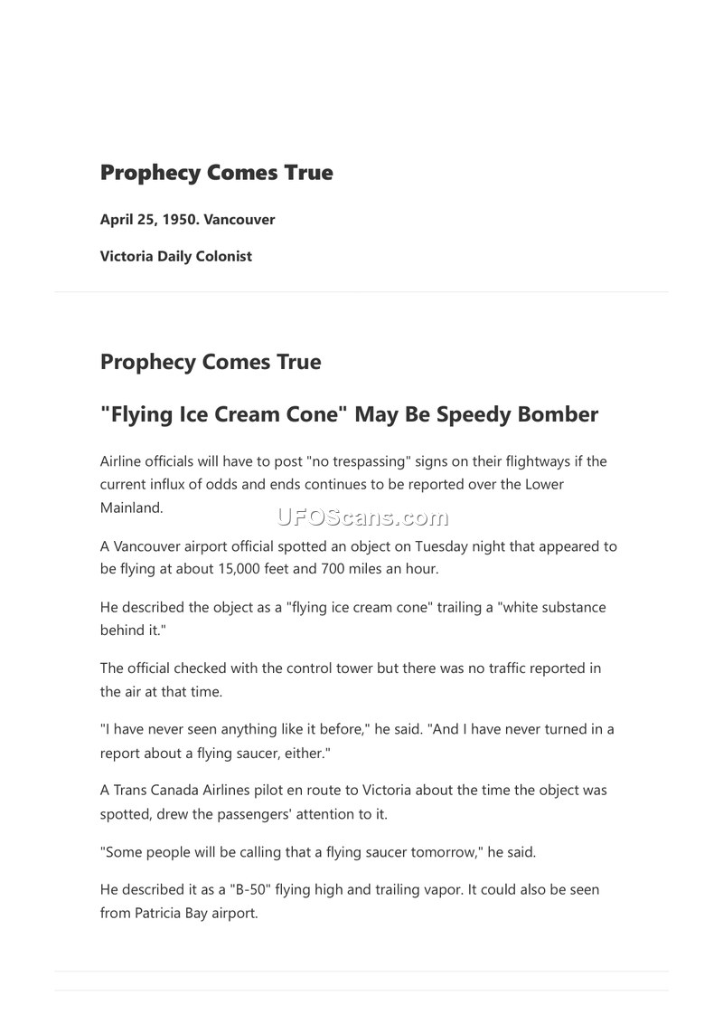 On April 25, 1950, a Vancouver airport official and a Trans Canada Airlines pilot reported sighting an unidentified object over the Lower Mainland. The object was described variously as a 'flying ice cream cone' and a 'B-50' aircraft.