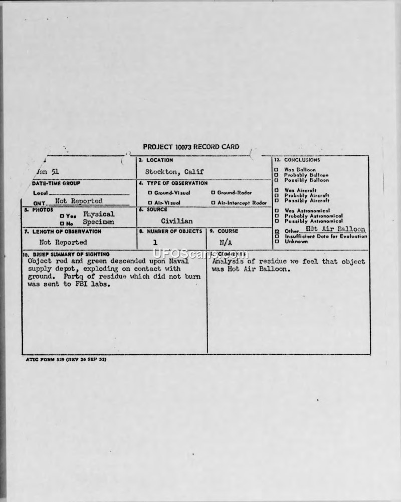 A red and green balloon-shaped object exploded at the Stockton Naval Supply Annex on January 1, 1951. FBI and Air Force investigations concluded the object was a home-made hot air balloon.