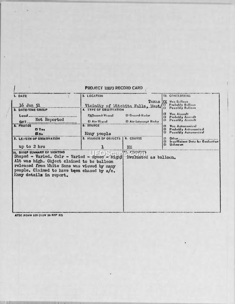 A 1951 Air Force intelligence report documents a sighting of strange lights by multiple witnesses in Texas. The official investigation concluded the objects were balloons released from White Sands.
