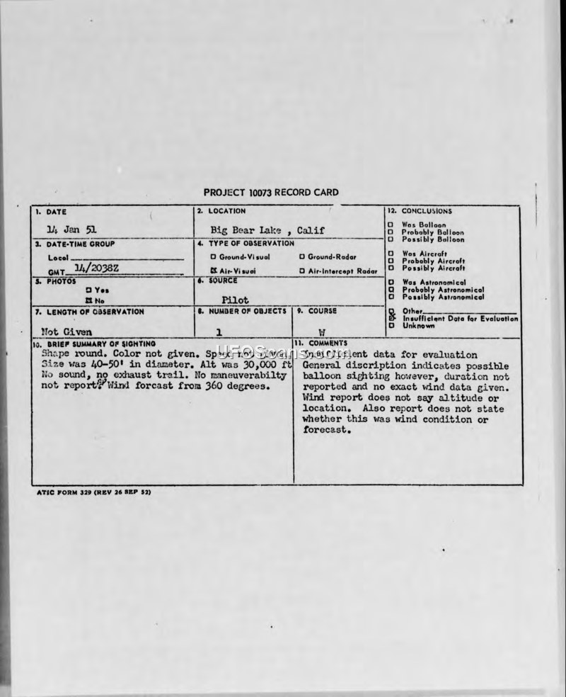 Project 10073 Record Card — Big Bear Lake, Calif, 14 Jan 51