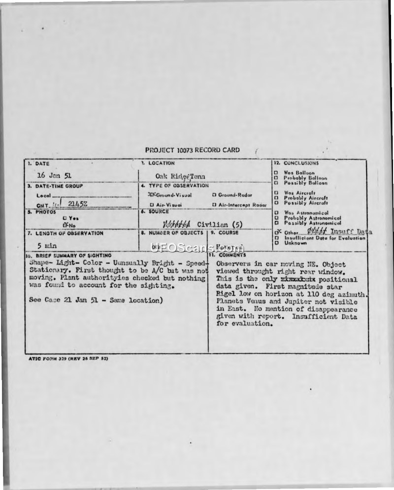 Project 10073 Record Cards and Summary of Information: Oak Ridge, Tennessee (16 & 21 January 1951)