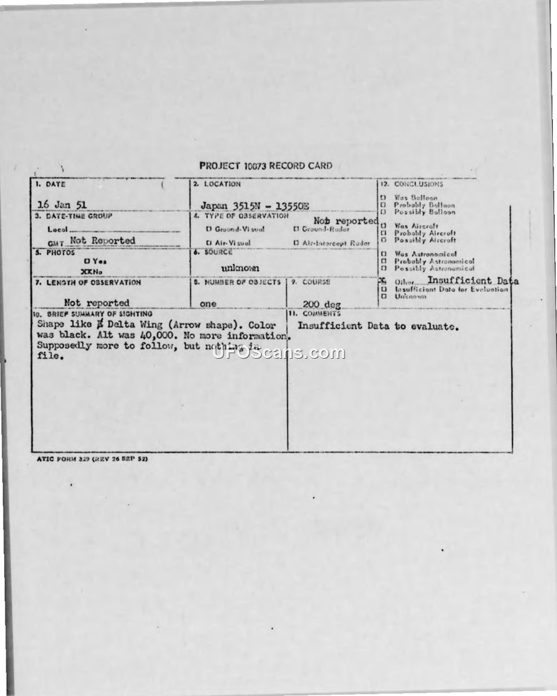 A 1951 military report documents a black, delta-wing object sighted over Japan at 40,000 feet. The investigation concluded there was insufficient data to evaluate the event.