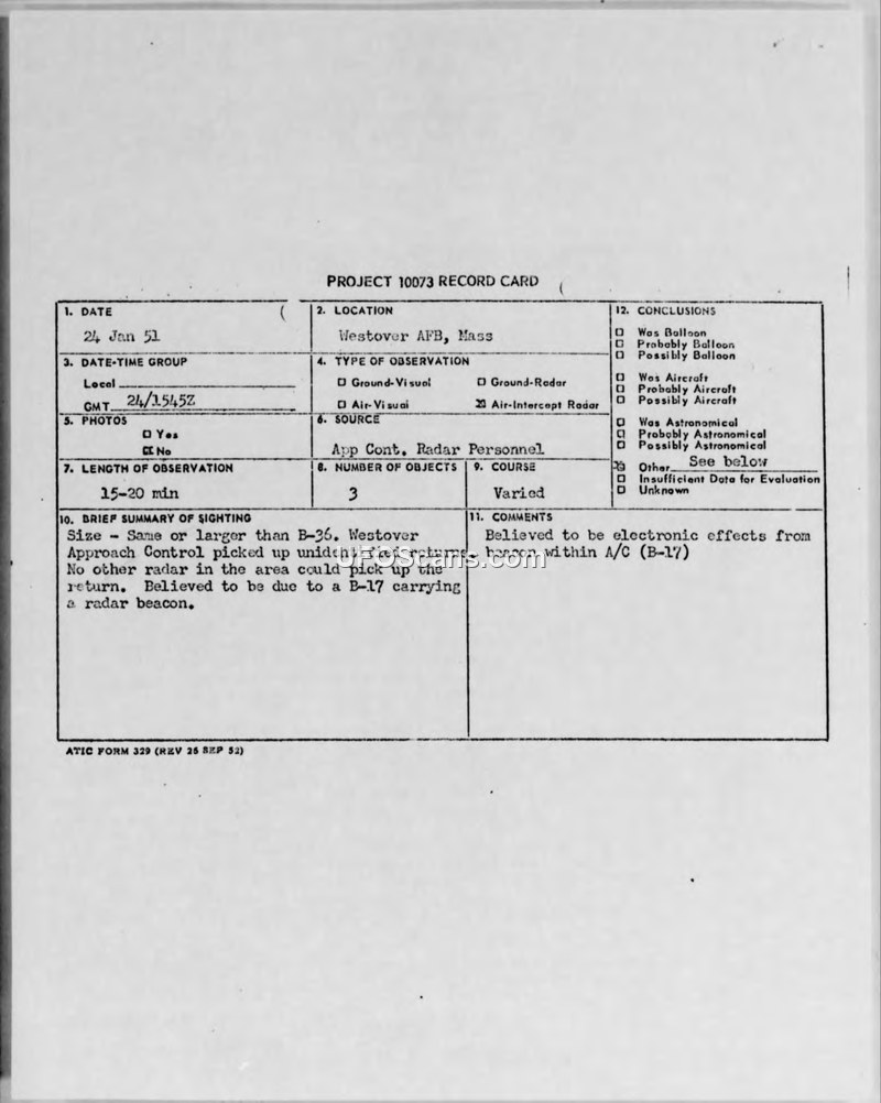 This document collection details investigations into unidentified aerial phenomena conducted under Project 10073 in early 1951. The primary incident occurred on January 24, 1951, at Westover Air Force Base, Massachusetts, where Approach Control personnel observed three unidentified radar returns. These returns were described as being the size of a B-36 aircraft. Subsequent analysis by the Air Materiel Command at Wright-Patterson Air Force Base suggested that these radar targets were almost certainly caused by a B-17 aircraft equipped with a radar beacon, which created electronic interference on the airport's radar scopes. The report notes that no other radar in the area could detect the targets, and the "DING BAT" F-86 fighter squadron could not be dispatched to intercept due to inclement weather. A second, separate incident occurred on January 25, 1951, in Warner Robins, Georgia. A witness, Mr. Farmer, reported seeing an oblong, non-glossy, black object at an altitude of 4,000 to 6,000 feet. He described the object as having a light that projected from the entire unit and moved in a "climbing steps" fashion. The investigation into this sighting included checks with the local weather station and air traffic control at Cochran Field, which confirmed various aircraft movements in the area at the time. Major P. Kubala, the Intelligence Officer, concluded the report by noting that no physical evidence, such as fragments or photographs, existed for the Warner Robins sighting. The documentation includes routing sheets, internal correspondence between Air Force commands, and spot reports from witnesses, reflecting the military's systematic approach to evaluating these reports during the early Cold War period.