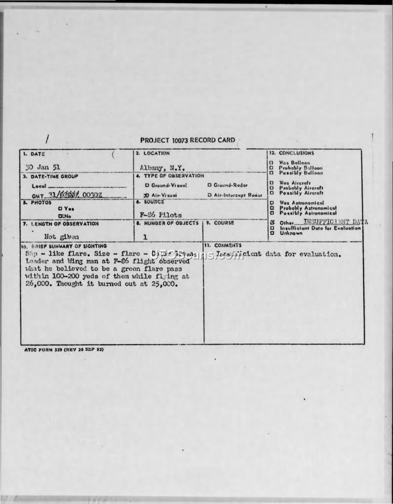 Project 10073 Record Card: Sighting of Green Flare, Albany, N.Y., 30 January 1951