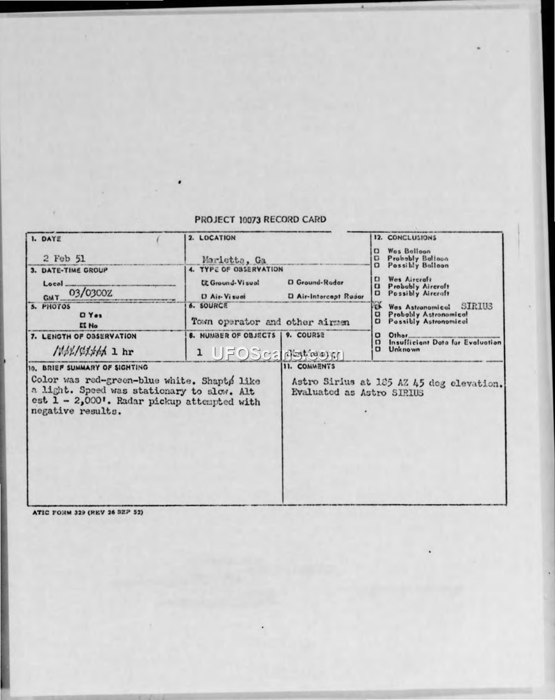 On 2 February 1951, between 2200 and 2300 hours, personnel at Dobbins Air Force Base in Marietta, Georgia, observed an unidentified light in the sky. The object was described as having red, green, and blue-white colors and was reported to be stationary or moving slowly at an estimated altitude of 1,000 to 2,000 feet. The sighting was reported by multiple individuals, including a control tower operator and members of the base weather detachment. An AFQ-13 radar operator attempted to track the object but was unsuccessful, citing low elevation and ground interference. Additionally, a Navy pilot from VS-22 NAS, Norfolk, reported observing a white light moving toward Atlanta at approximately 2115 hours while en route from Norfolk. The official evaluation of the incident, documented on a Project 10073 record card, concluded that the object was the star Sirius, located at 185 degrees azimuth and 45 degrees elevation. The report was forwarded through the Fourteenth Air Force to the Air Materiel Command at Wright-Patterson Air Force Base in accordance with standard reporting procedures for unconventional aircraft.