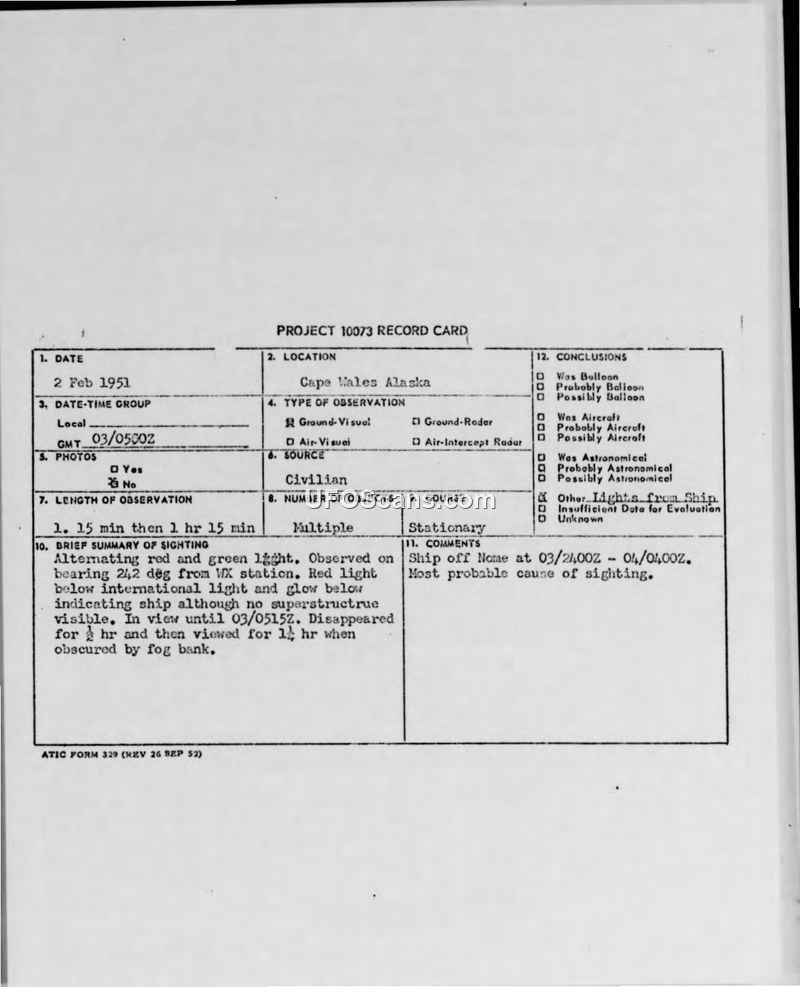 A February 1951 sighting of lights in Wales, Alaska, by Weather Bureau personnel was investigated under Project 10073. Military authorities concluded the lights were likely from a ship off the coast of Nome.