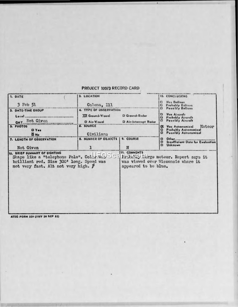 PROJECT 10073 RECORD CARD — Galena, Illinois, 3 Feb 51
