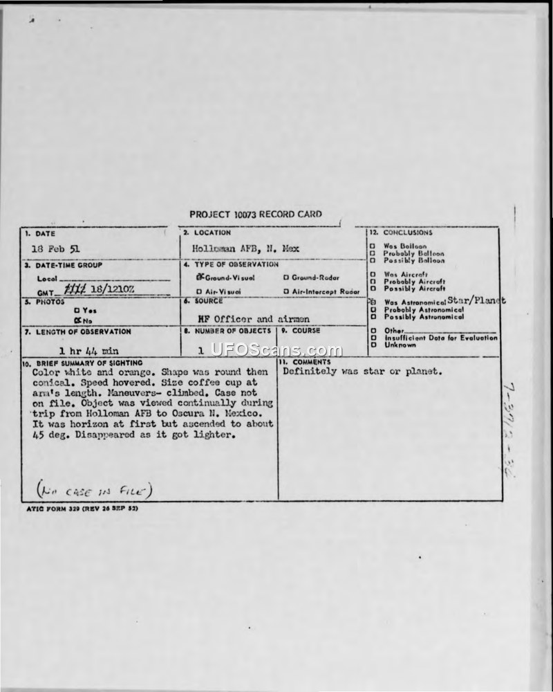 This document is a Project 10073 record card detailing a sighting that occurred on February 18, 1951, at 1210Z. The observation was made by an Air Force officer and airmen while traveling from Holloman Air Force Base to Oscura, New Mexico. The witnesses reported observing a single object for a duration of one hour and forty-four minutes. The object was described as being white and orange in color, initially round in shape before appearing conical. The witnesses estimated the size of the object to be equivalent to a coffee cup held at arm's length. Regarding its behavior, the object was observed hovering and then climbing; it was noted to be at the horizon initially before ascending to an angle of approximately 45 degrees. The object eventually disappeared as the ambient light increased. The report explicitly states that no photographs were taken and there was no radar contact. The final conclusion recorded on the card is that the object was definitely a star or a planet. The document notes that this case was not previously on file.