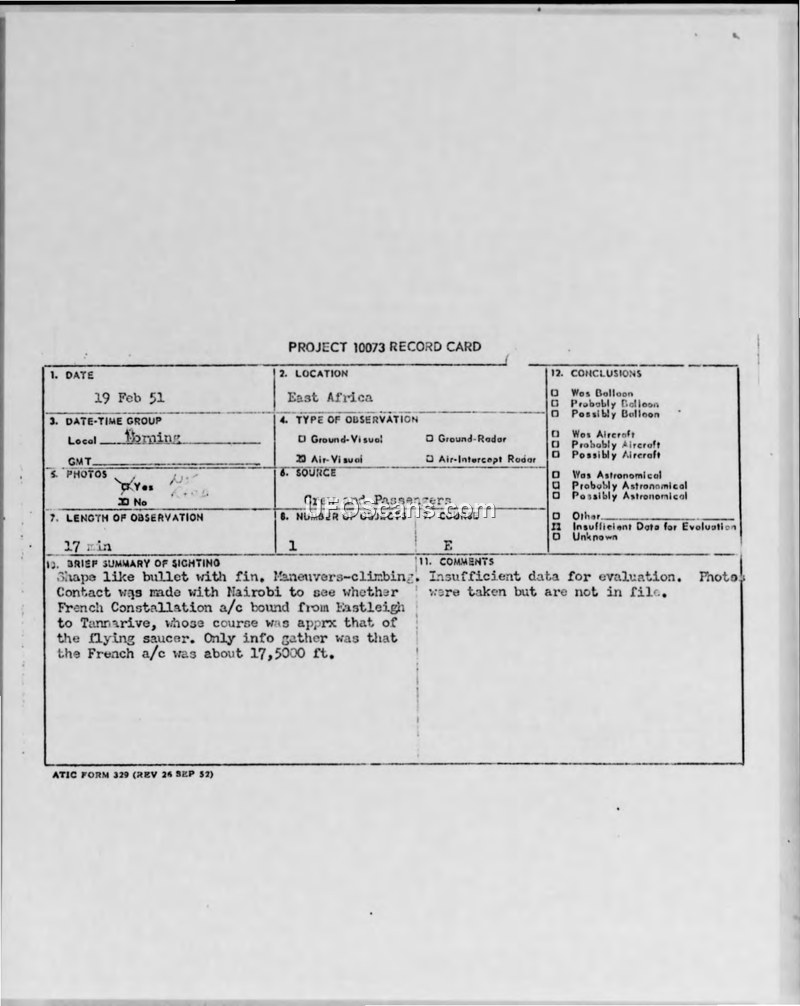 Project 10073 Record Card — Appearance of an Alleged Flying Saucer over Mt. Kilimanjaro, Tanganyika