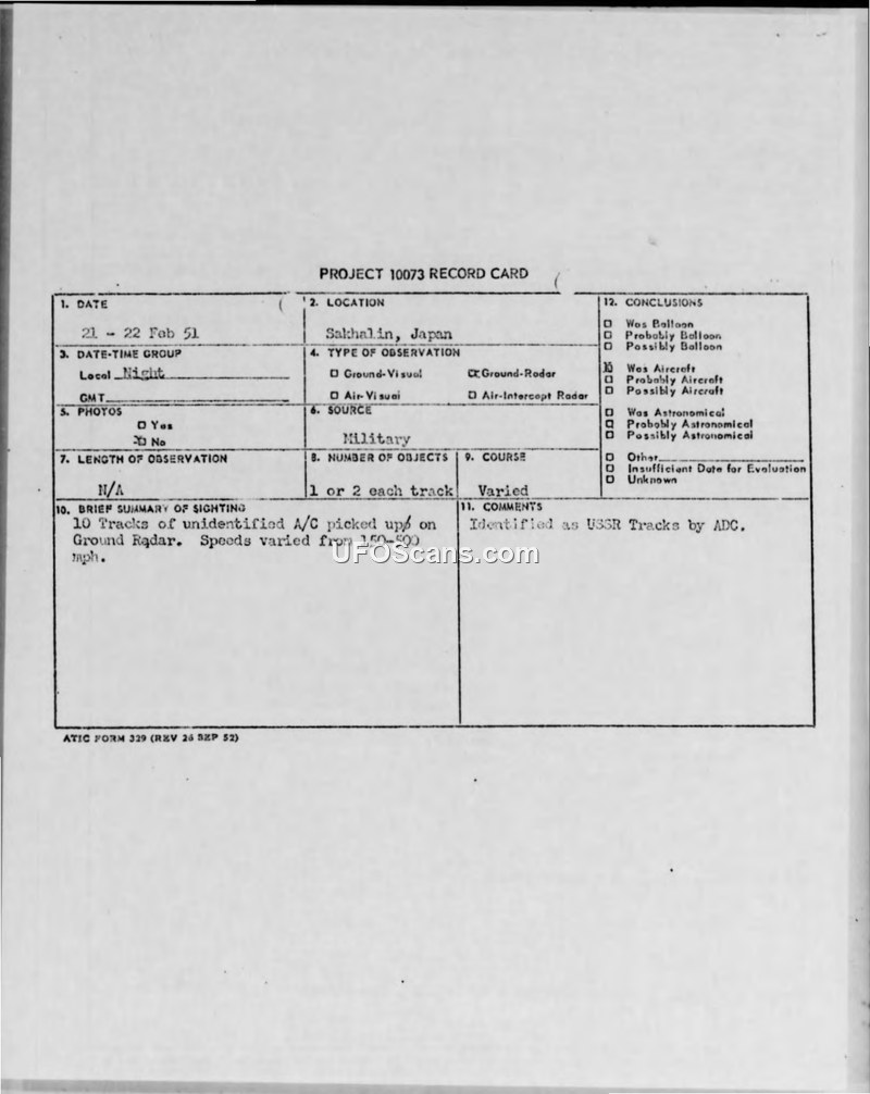 The report documents numerous radar tracks of unidentified aircraft near Sakhalin, Japan, during February 1951. Intelligence analysis concluded these were Soviet aircraft, noting an increase in night-flying activity and suggesting the Soviets were either attempting to achieve greater proficiency in night flying or maintaining existing proficiency levels.