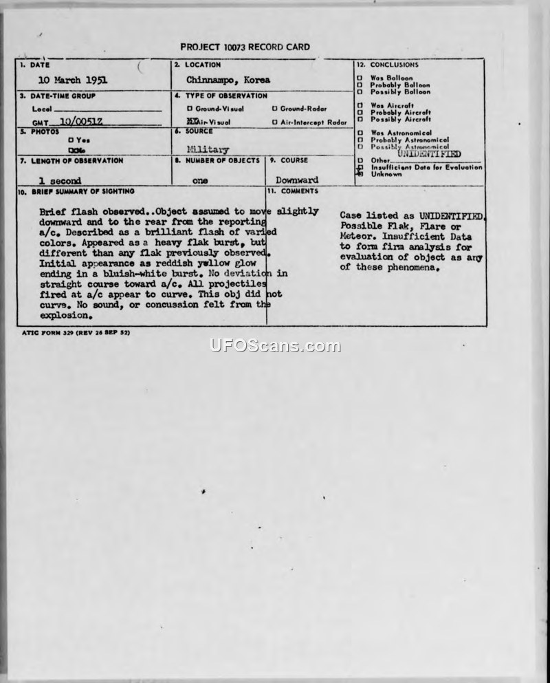 PROJECT 10073 RECORD CARD: Sighting Incident 10 March 1951