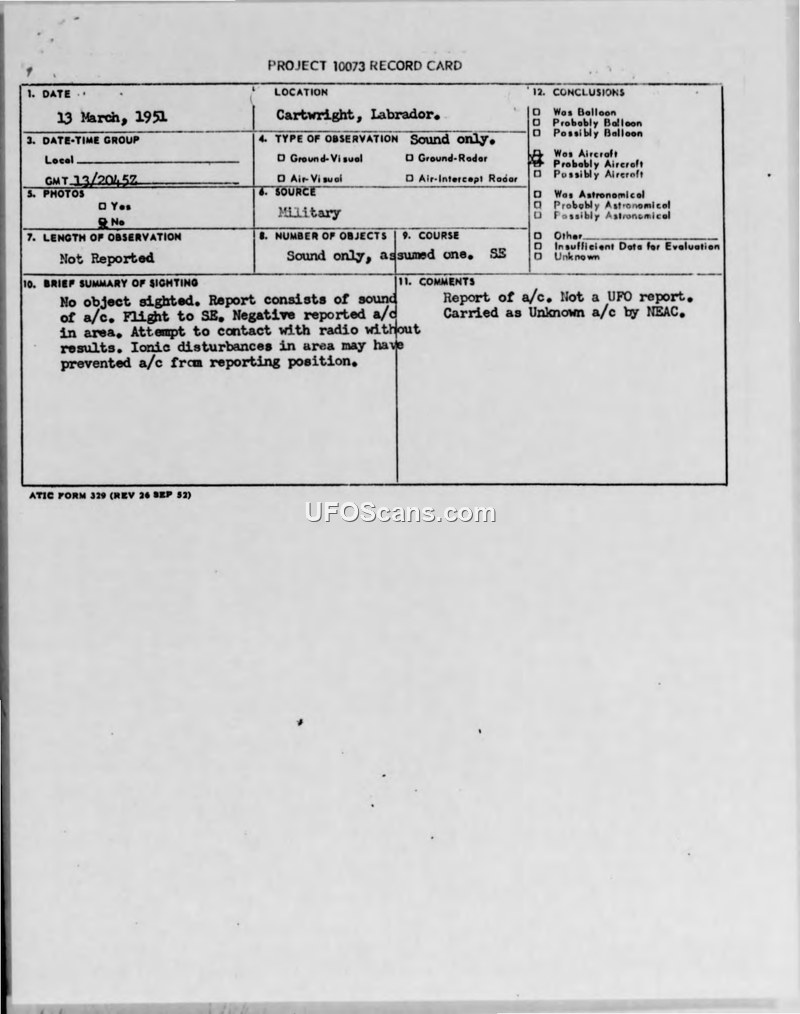 On 13 March 1951, at 2045Z, an unidentified aircraft was reported heard over the reporting station at Cartwright, Labrador, located at 53 degrees 40 minutes North latitude and 56 degrees 50 minutes West longitude. The aircraft was described as moving in a South East direction. Following the report, the Northeast Air Command (NEAC) conducted an investigation, which included checking flight plans and position reports with Gander Air Traffic Control, Harmon Airways, and Argentia Naval Radio. These checks yielded no information regarding any aircraft in the Cartwright area at that time. The report notes that attempts to contact the aircraft via radio were unsuccessful. It was suggested that ionic disturbances in the area may have prevented the aircraft from reporting its position or filing a flight plan. The incident was formally documented on a Project 10073 record card. The final conclusion reached by the military authorities was that the event was a report of an aircraft and explicitly 'not a UFO report.' The incident was subsequently carried in military records as an 'Unknown a/c' by NEAC. A follow-up message (EN 0429) confirmed that a check of all bases and aircraft control centers within the NEAC area revealed no aircraft over the Cartwright area on that date, and the aircraft remained unidentified within the command.