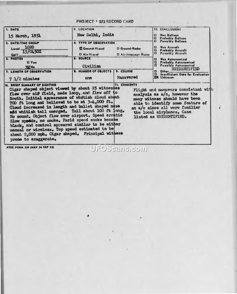 Project 073 Record Card — New Delhi, India, 15 March 1951